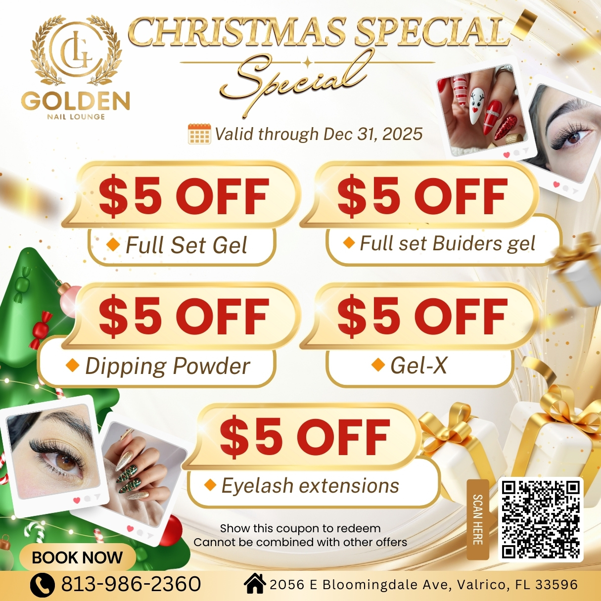Elevate your holiday style with long-lasting, perfectly polished nails or refreshed, voluminous lash extensions. With this promotion, you will receive $5 OFF the following services: